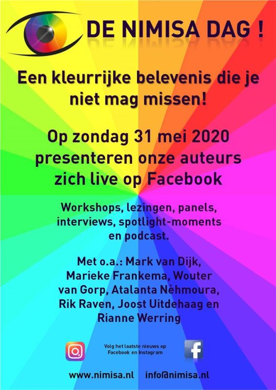 Op zondag 31 mei organiseert uitgever Nimisa Publishing House de Nimisa Dag, een online Facebook-festival vol workshops, interviews, paneldiscussies en aanbiedingen. Met onder andere Mark van Dijk, Marieke Frankema, Wouter van Gorp en Atalanta Nèhmoura.