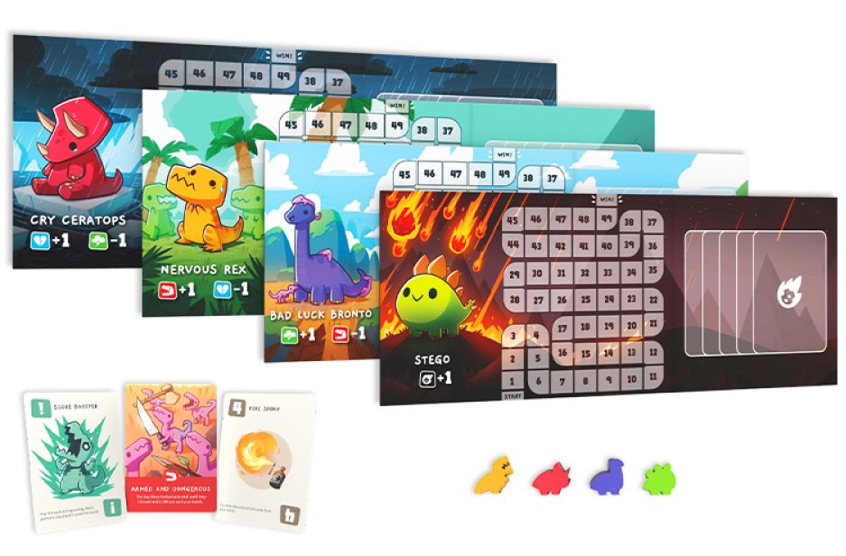 In Happy Little Dinosaurs kies je een van vier dinosaurussen om mee te spelen: Stego, Cry Ceratops, Nervous Rex en Bad Luck Bronto. Iedere ronde wordt er een rampenkaart omgedraaid die te verdelen is in vier categorieën: natuurrampen, roofzuchtige rampen, emotionele rampen of een meteoor.