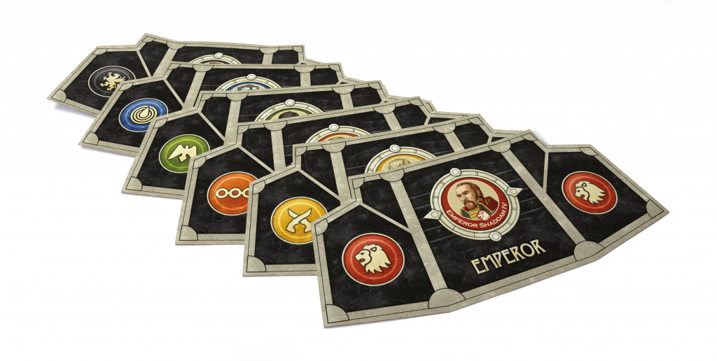 Spelbord, Regels, Snelstart gids, 6 Spelers schilden, 6 Speler beschrijvingen, 2 Gevechtswielen, 119 spelkaarten, 324 fiches.
